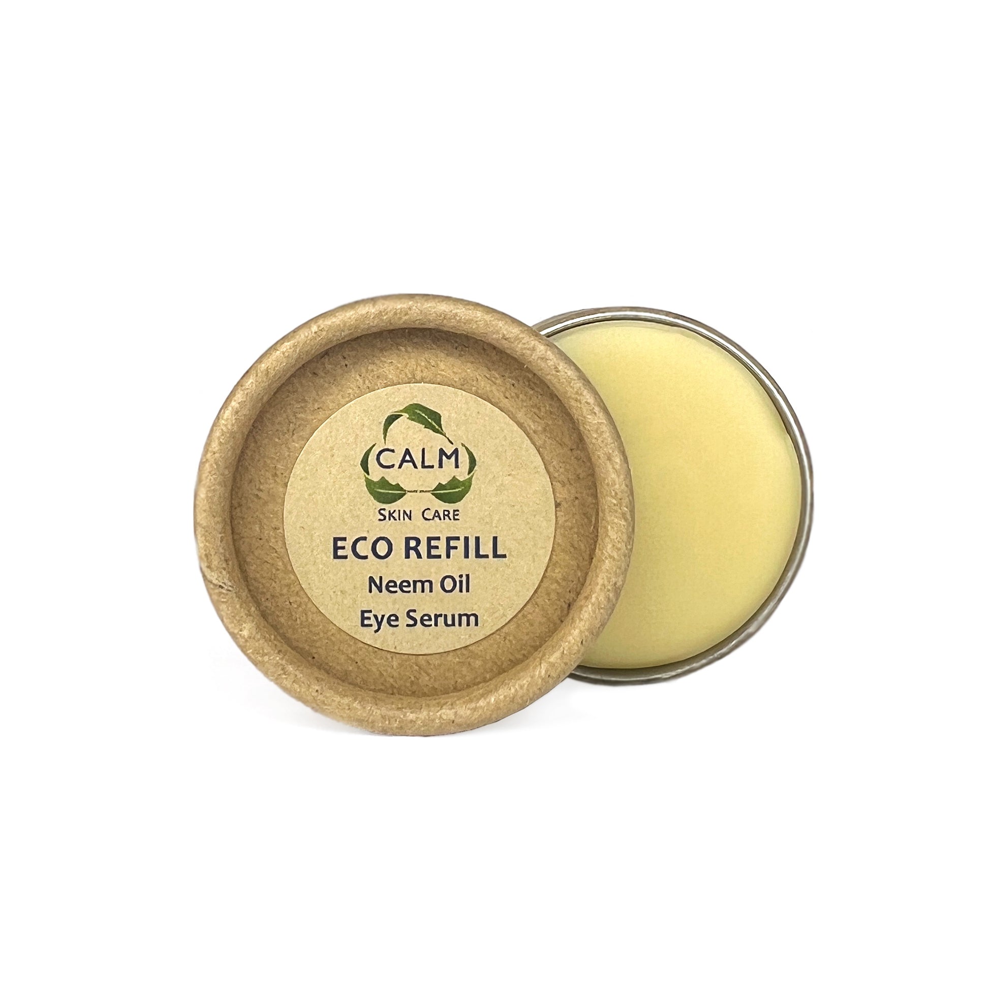 CALM Eco Refill Neem Oil Eye Serum + Eye Makeup Remover - Antioxidant rich Neem Oil works with Shea Butter to provide soothing moisture and stimulate the growth of collagen, while Jojoba Oil (closest oil to our skin’s natural sebum) provides elasticity. Helps reduce fine lines and improve texture for eyes and neck. As an alcohol free eye makeup remover, this serum can also gently remove eye makeup without irritating side effects.